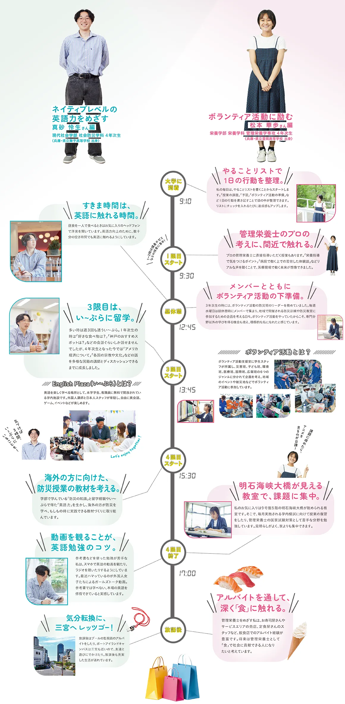 神戸学院大学には、「ハイレベルな英語スキルの修得」や「管理栄養士の国家試験合格」など夢に向かって日々励んでいる学生がいます。