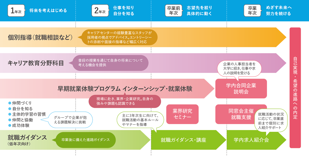 1年次からのキャリア教育をはじめ、国家試験対策、資格取得の支援まで、一人ひとりの学びを社会へとつなぐ支援体制が、学生をバックアップします。