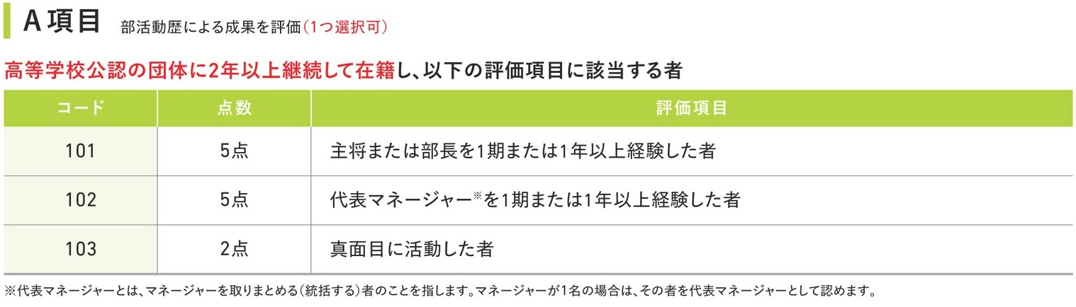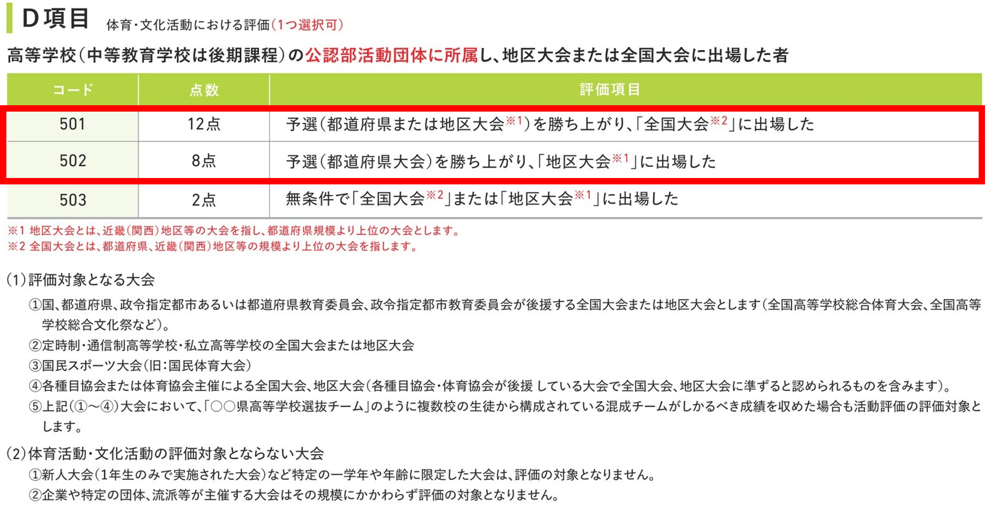 D項目:体育・文化活動で、地区大会、全国大会へ出場したことを評価A項目
