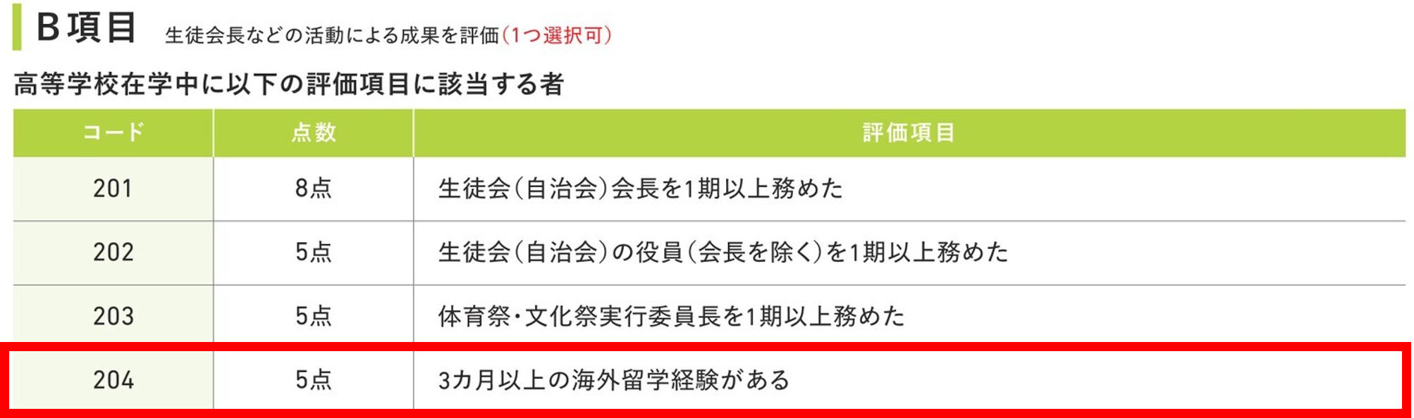 B項目:生徒会長などの経歴および海外留学経験の活動を評価