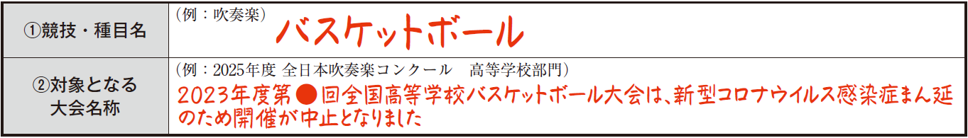 正規開催された都道府県大会等(全国大会または地区大会の予選)の結果で、全国大会(または地区大会)の出場資格を取得していたにもかかわらず、 感染症や大規模な災害の発生等の影響でそれらの大会が中止または延期されたため、出場できなかったと認められる者は、 コード501「予選(都道府県大会または地区大会)を勝ち上がり、「全国大会」に出場した」、またはコード502「予選(都道府県大会)を勝ち上がり、「地区大会」に出場した」ものとみなし、活動評価の申請を受け付けます。